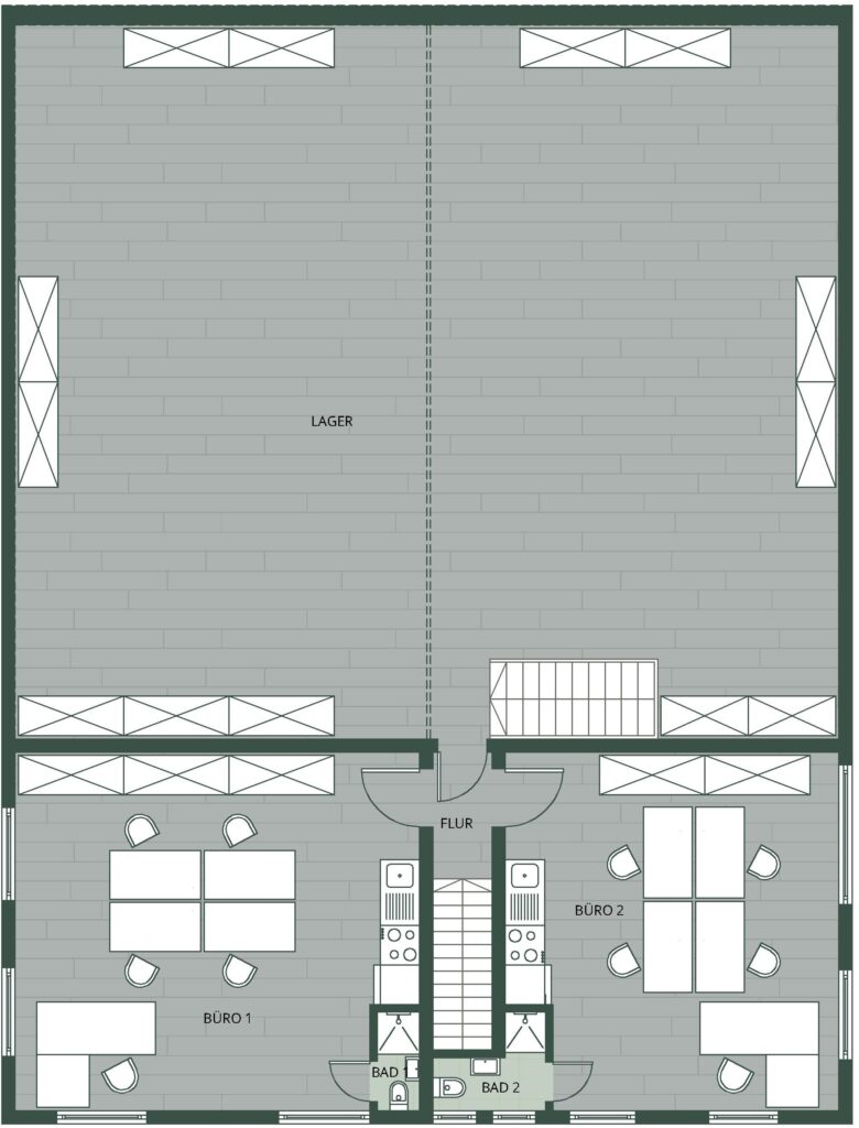 • EG: ca. 323 qm Nutzfläche (Lagerhalle) plus ca. 106 qm gewerbliche Fläche (Büro und Sozialtrakt)