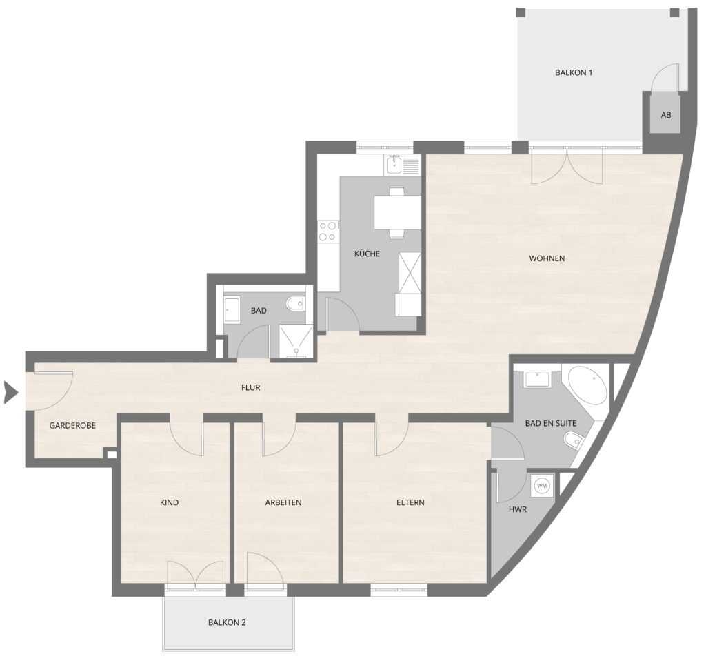 Die Wohnung ist vielseitig nutzbar und bietet bis zu 3 Schlafzimmer (so aktuell gestaltet). Jedes Zimmer bietet ein ganz besonderes Highlight: die beiden Kinderzimmer verfügen jeweils über einen Zugang zum gemeinsamen Balkon (Nord-West), das Elternschlafzimmer punktet durch die großzügige Badeoase en-suite und der große Wohnbereich ist an den Haupt-Balkon (Süd-Ost) zum ruhigen Innenhof angeschlossen. In der Küche kann optional die hochwertige Einbauküche mit Markengeräten übernommen werden.