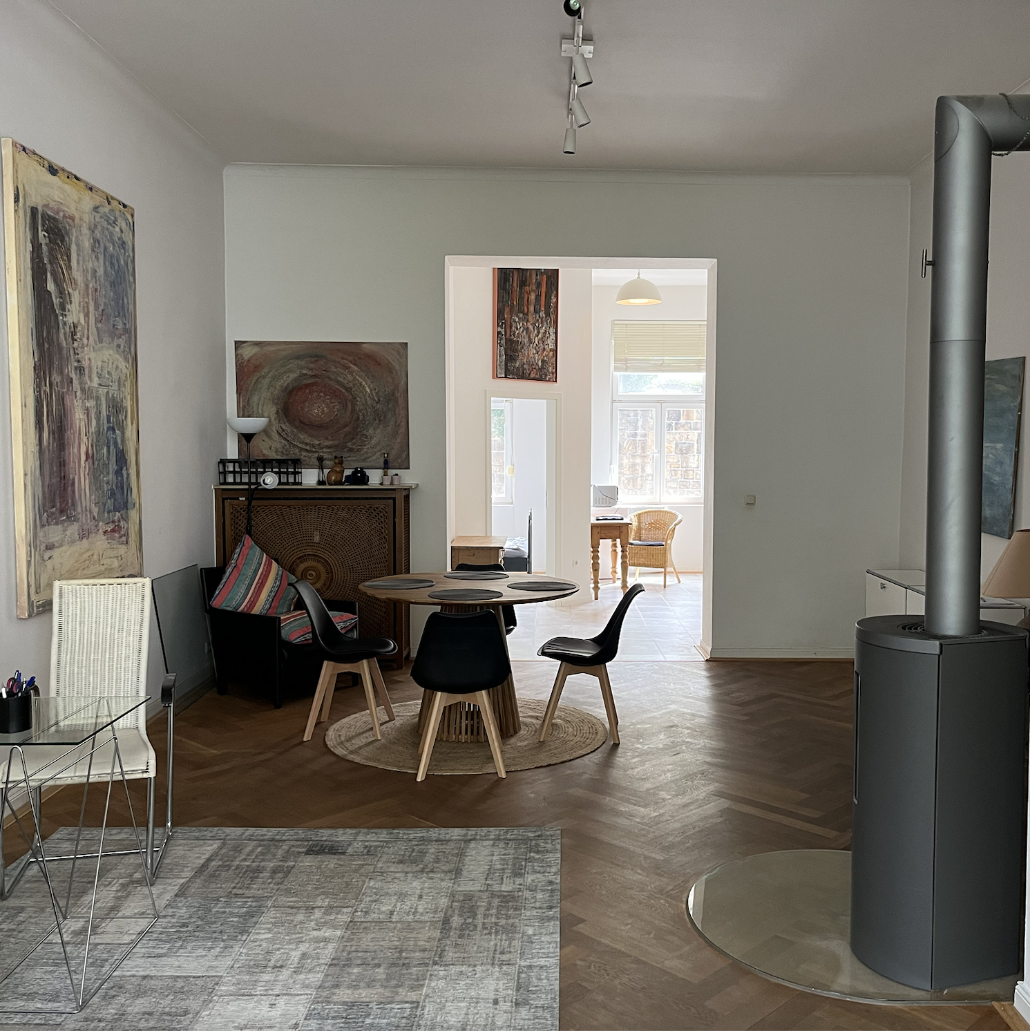 Die vorliegende Wohnung besticht durch ihren Altbaucharme mit besonders hohen Decken (3,75m), dem Fischgräten-Dielenboden und den ansprechenden Sprossenfenstern. Die moderne und zeitlose Möblierung bietet einen tollen Kontrast zum Baustil. Der sehr große Wohn-/ Essbereich mit Fensterfronten zu zwei Seiten bildet das Herzstück der Wohnung. Von dort erreichen Sie sowohl den Garten als auch die Küche und das Gäste-/ Arbeitszimmer. In einem separaten Bereich, der über den Flur erreicht wird, liegt das Haupt-Schlafzimmer mit dem Bad en suite sowie einem separaten WC.