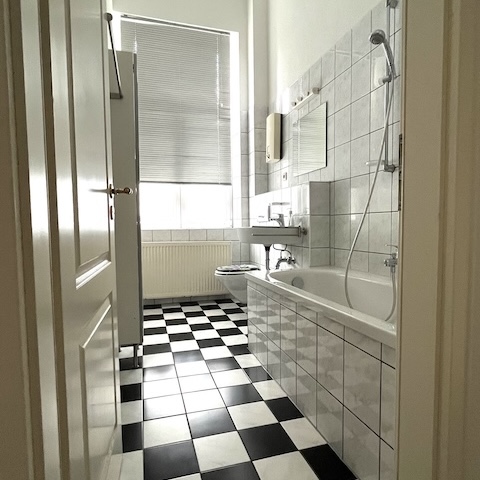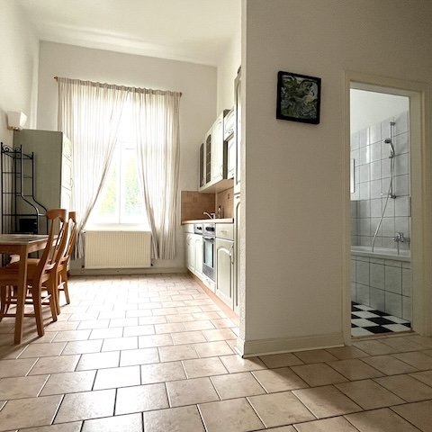 Die vorliegende Wohnung besticht durch ihren Altbaucharme mit besonders hohen Decken (3,75m), dem Fischgräten-Dielenboden und den ansprechenden Sprossenfenstern. Die Möblierung ist passend zum Baustil gewählt. Der sehr große Wohn-/ Essbereich mit Fensterfronten zu zwei Seiten bildet das Herzstück der Wohnung. Da die Wohnung trotz ihrer Größe nur ein Schlafzimmer aufweist, ist die Wohnung nur für 1-2 Personen geeignet.